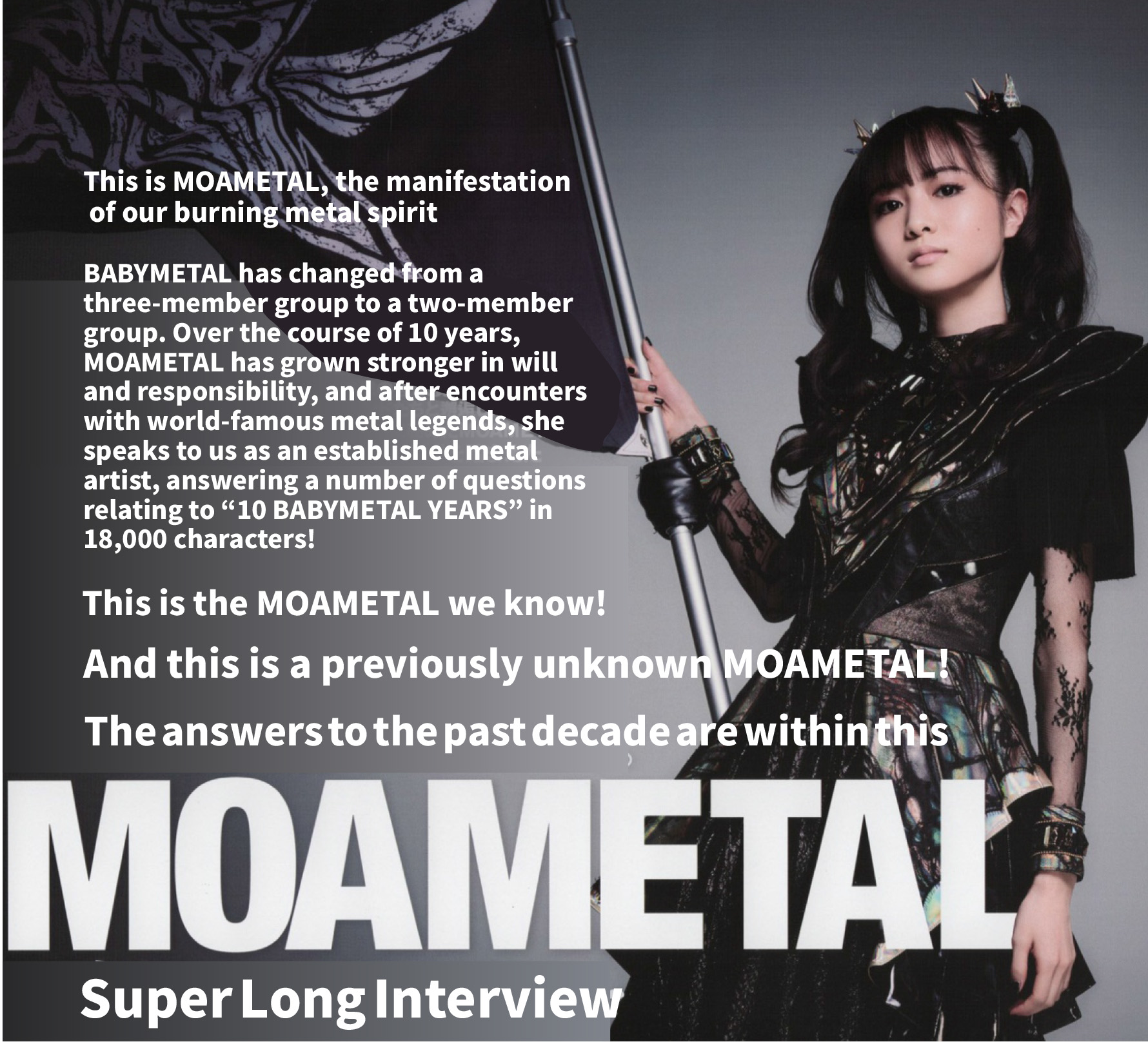 (*Translator’s Note: regarding “This is MOAMETAL, the manifestation of our burning metal spirit”, the the original Japanese text here is a play on lyrics from Road of Resistance, which go “燃える鋼鉄魂 それが僕らのResistance”. The second half means “this is our Resistance”. In this interview, the tagline is changed very slightly to “燃える鋼鉄魂 俺たちの......MOAMETAL” The first half is the same, but the second half is changed to “this is our MOAMETAL”)