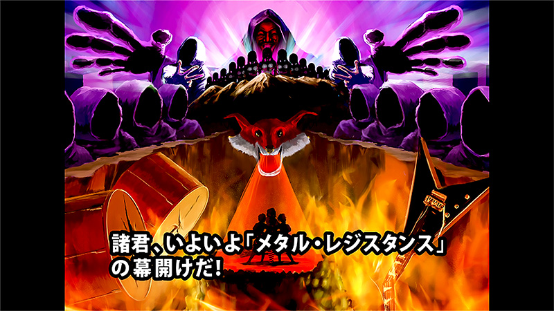 「昨今、世界は巨大勢力“アイドル”の圧倒的な魔力によって支配され、「メディア」「政治」「経済」を含むすべてがアイドルに牛耳られていた....。アイドルソング以外の音楽はすべて有害とされ、“メタル”もその例外ではなかった。魂を奪われたメタラーたちは、メタルの復権を祈った。やがてその祈りはメタルを司る神“キツネ様”へと届くことになる。」