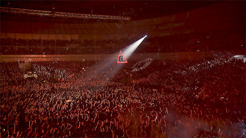 So-called flying in musicals and concerts is usually done with harnesses attached to the body. But I wondered if it would be possible to fly in something that looked different, like a vehicle. At the 2014 Budokan, the storyline of leaving Japan and going overseas was expressed using a coffin flying into the sky, and this imagery was a self-homage to that. After finishing the 3rd chapter of Metal Resistance, we headed towards the 4th chapter and Wembley Arena. We wanted to provide visual imagery to go with the story of the members leaving Japan once again on a flying pyramid to go abroad.