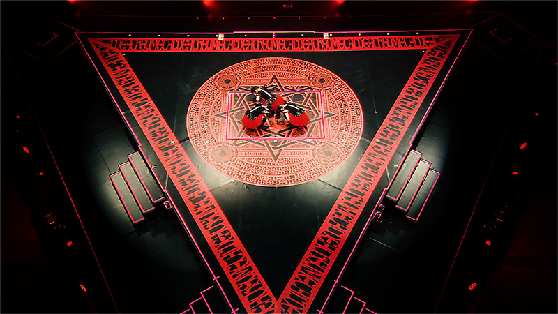 A huge pyramid with a magic circle pattern covered the triangular stage, in accordance with the 3rd chapter of Metal Resistance. The girls appeared on stage the moment the pyramid disappeared.